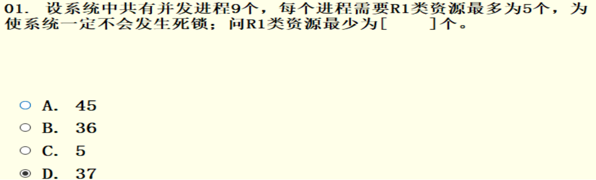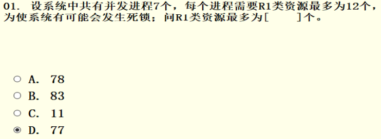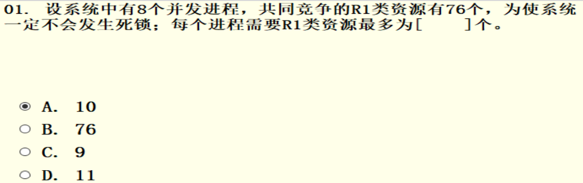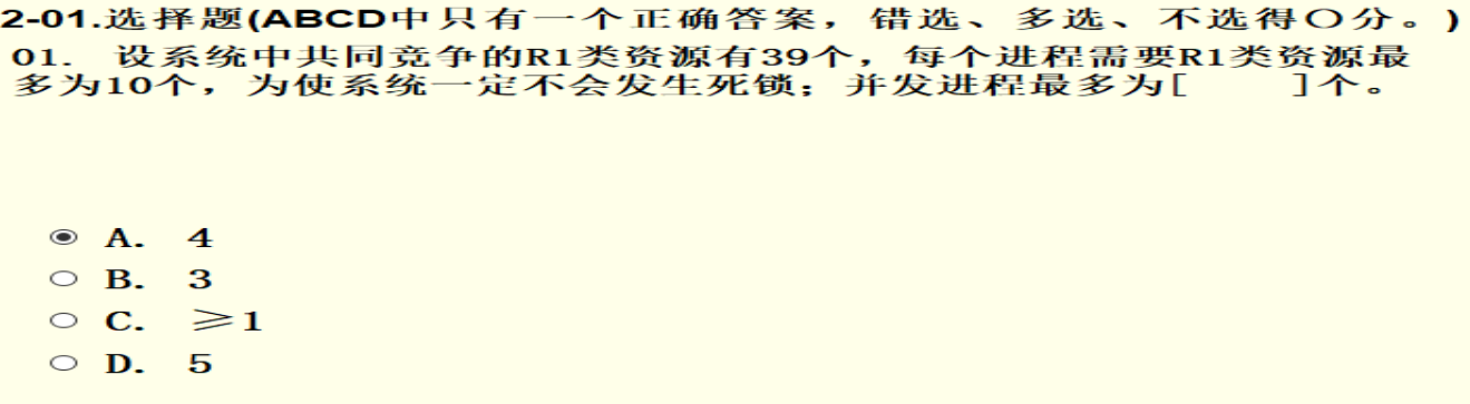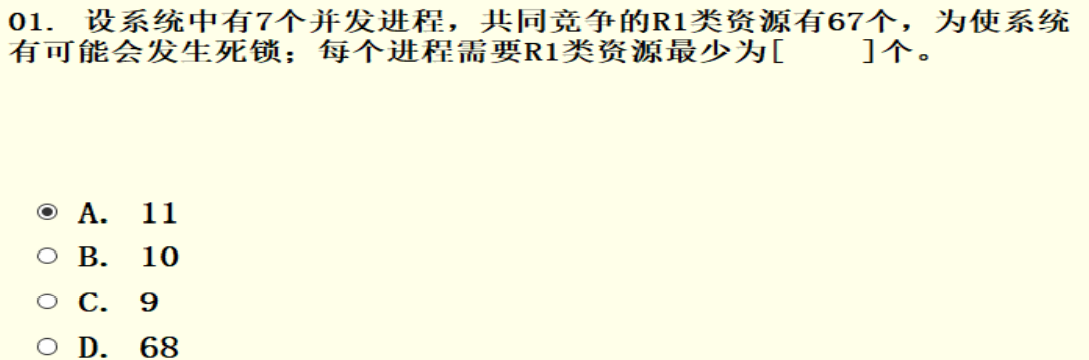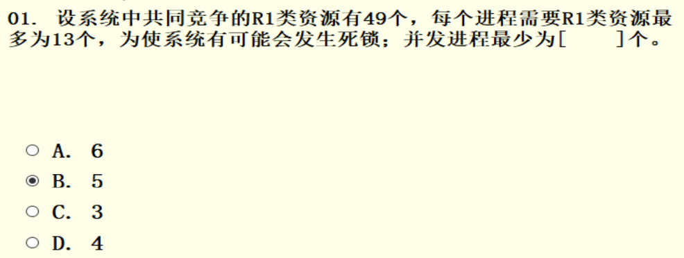 5、已知B、C,问有可能发生死锁的最小A? A= ⌈C/(B-1) ⌉