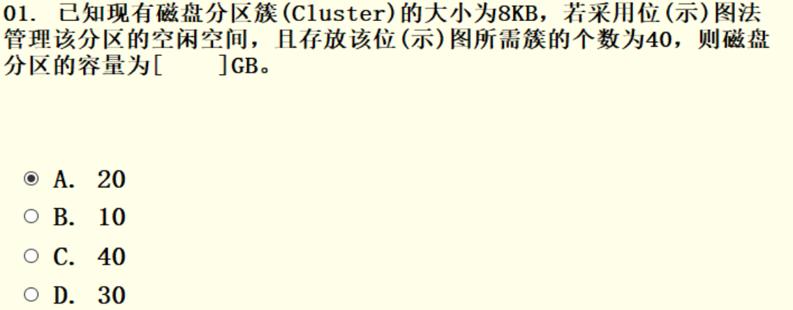 磁盘分区容量n= 位示图的位个数 * 簇的大小a(K) = m * a * 1024 * 8 * a (K) = (m * a * a * 8)/1024 (G)
