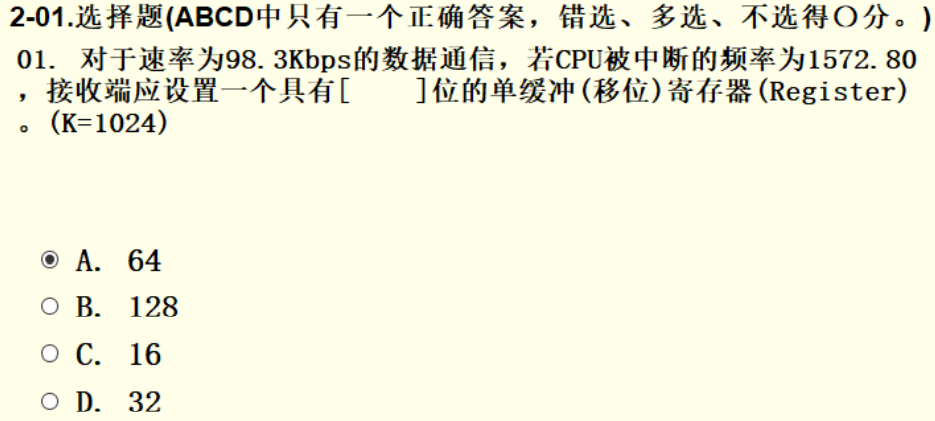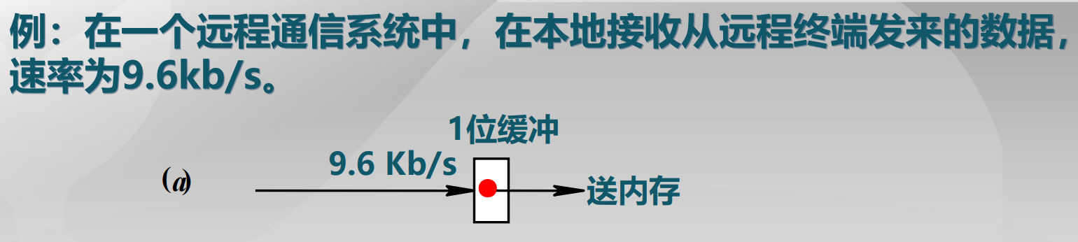 数据的速率为9.6Kb/s,即每秒有9.6K位数据送入,由于缓冲只有1位,所以每来一位数据就会发生一次中断,频率为9.6K/s。