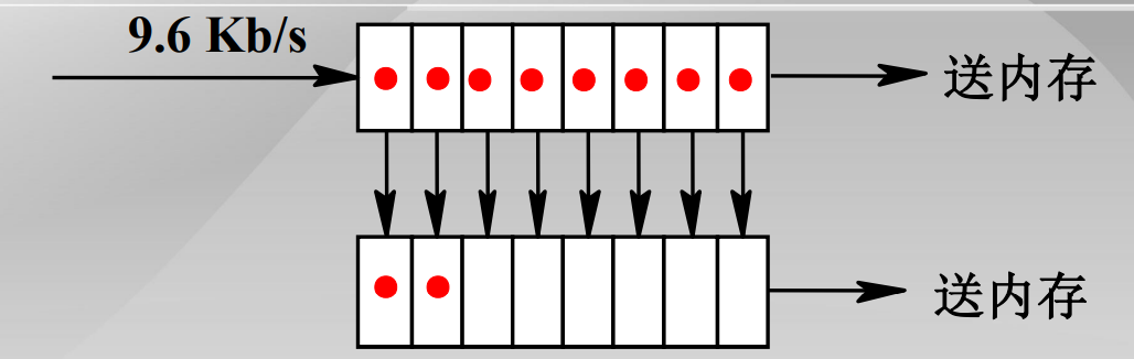 缓冲变成了8位,那么只有当8位都装满数据后CPU才发生中断,中断频率就变为了 9.6K/8位 = 1.2K/s