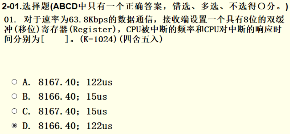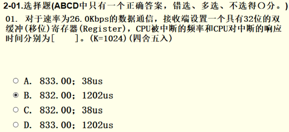 CPU相应时间: 发生中断后,为了不发生数据覆盖,CPU必须在新的一位数据来临之前取走当前的数据,即CPU相应时间就是发生中断后到下一位数据来临前取走缓冲区内的数据的时间。