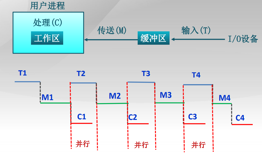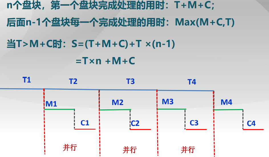 - n个盘块,第一个盘块完成处理的用时:T+M+C;
