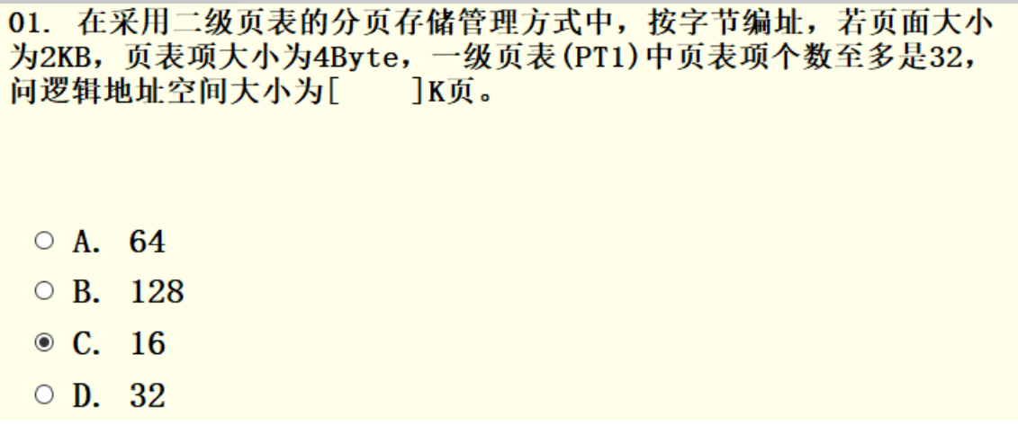 A—–页面大小; B—–页表项大小; C—-一级页表项个数; D—-逻辑地址空间大小(页数)
