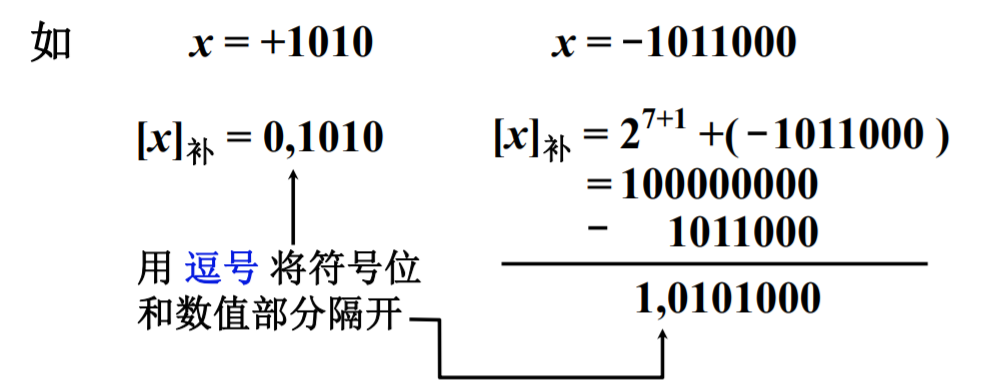 整数的第一位为符号位,用 “,”隔开,0表示正数,1表示负数,x为真值,n为整数的位数。