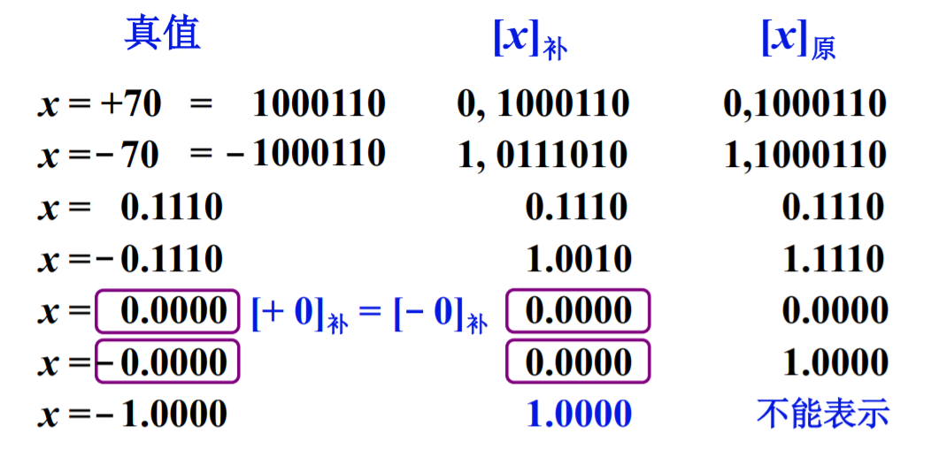 定点机中: $[ x ]_ 原 = [ x ]_ 补 = [ x ]_ 反 = 0.0010011000$
