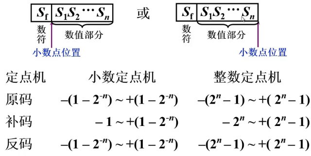 将数据分为纯整数和纯小数两类,用n+1位表示一个定点数,$x_n$为符号位,放在最左边,0表示正号,1表示负号。故一个数 $x$ 可以表示为 $x = x_nx_{n-1}…x_1x_0$