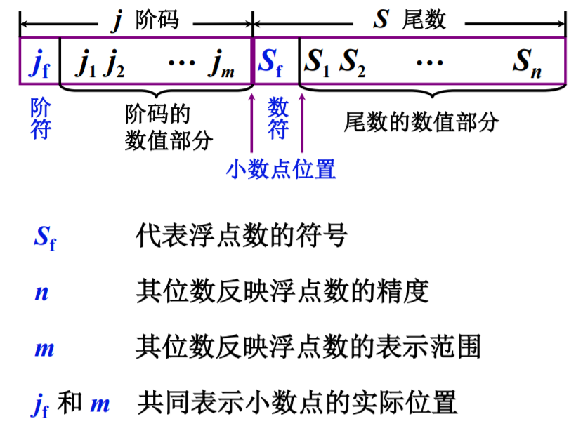 $M$称为浮点数的尾数,$e$ 称为指数,是一个整数,R是基数,一般隐式表示(通常2或10)。在机器中,尾数用定点小数形式表示,指数用定点整数形式表示,称为阶码。