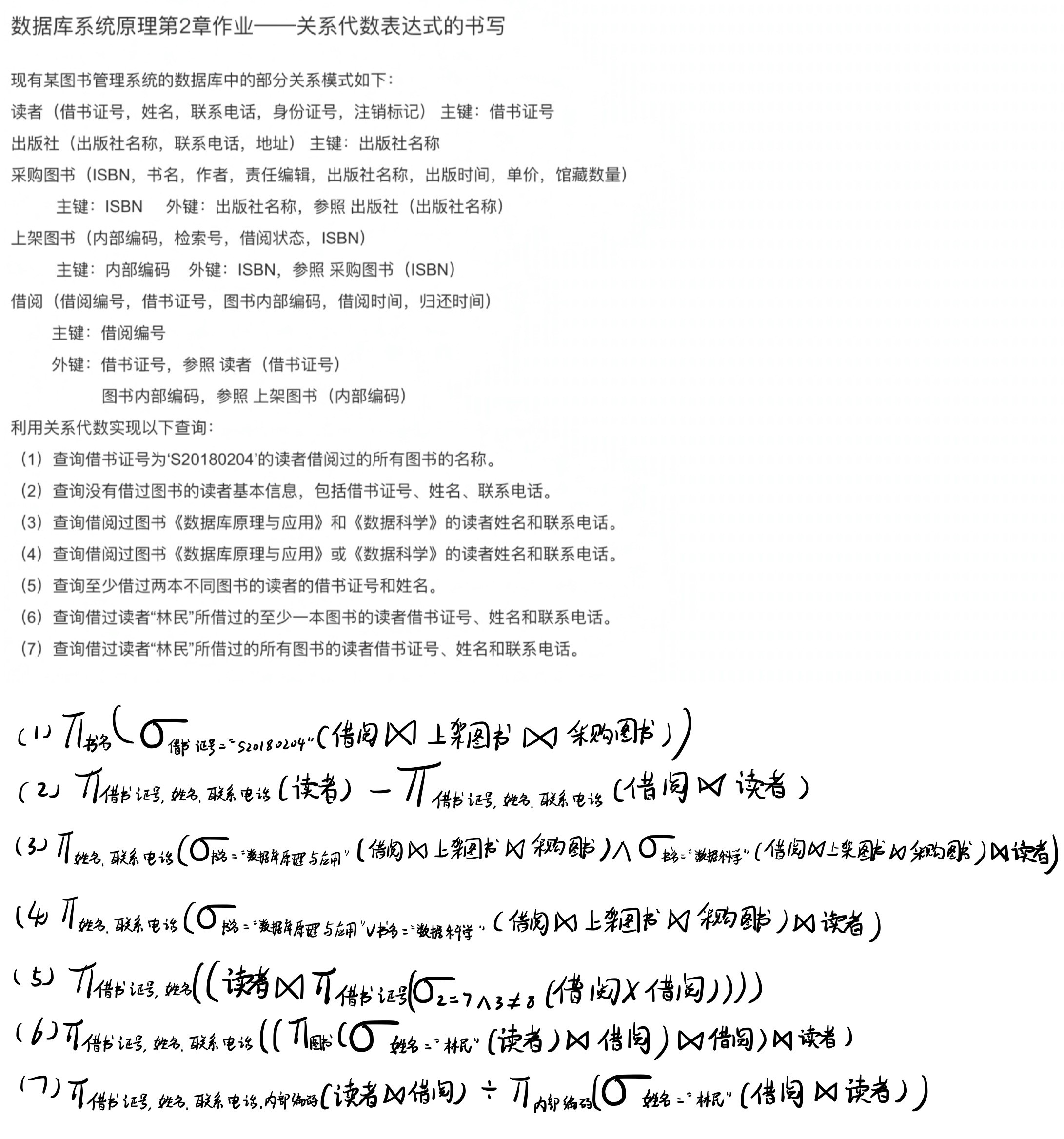 2.寻找没有借过书的读者的(借书证号)(姓名)(电话),直接查找比较困难。可以先表示出有借阅记录的读者,即在“借阅”和“读者”自然连接(自然连接的原因同上)后的表中投影出所需的属性,然后与所有的读者做差就是没借过书的人。