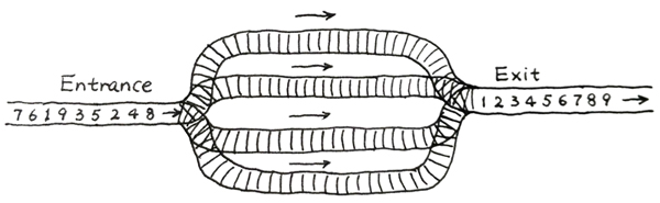两端分别是一条入口(Entrance)轨道和一条出口(Exit)轨道,它们之间有N条平行的轨道。每趟列车从入口可以选择任意一条轨道进入,最后从出口离开。在图中有9趟列车,在入口处按照{8,4,2,5,3,9,1,6,7}的顺序排队等待进入。如果要求它们必须按序号递减的顺序从出口离开,则至少需要多少条平行铁轨用于调度?